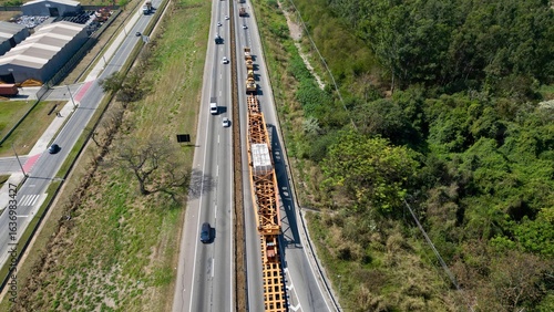 Transito com varios carros e caminhoes na dutra em movimento intenso, com fundo desfocado e imagem aerea.