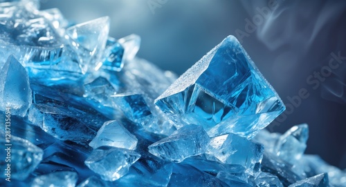 Translucent ice crystals in vibrant blue tones creating a textured, frosty surface with a cool, ethereal background.