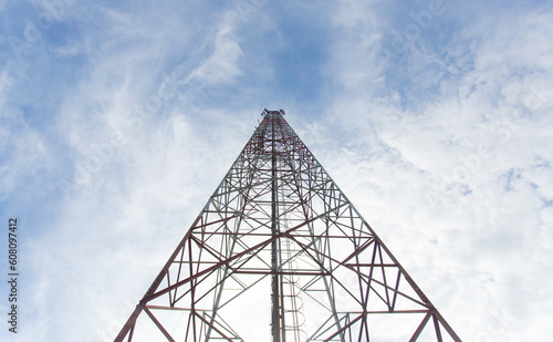 Transmission tower or cell phone tower with daytime sky and white clouds. Telecom tower. Antenna. Modern communication concept using internet.