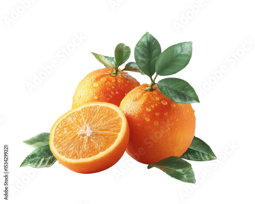 [Transparent Background PNG]Fresh Oranges with Leaves and Water Drops