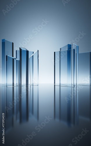 Transparent blue cube glass geometries background, 3d rendering.