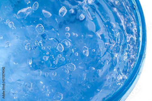 Transparent blue gel with oxygen bubbles texture close up. Abstract cosmetic background