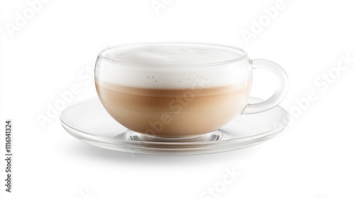 Transparent cappuccino cup with creamy milk foam on saucer against a clean white background showcasing beverage texture and elegance.