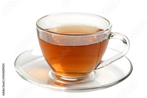Transparent cup of tea on a saucer isolated on white background closeup