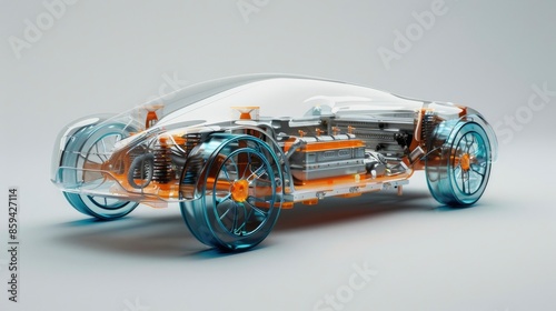 Transparent electric vehicle battery pack revealing inner mechanics and power distribution