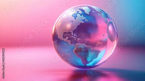 Transparent glass globe showing continents of North and South America with vibrant pink and blue light reflections on a smooth surface