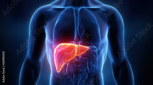 transparent torso diagram showing liver glowing other organs muted focus highlight scientific accuracy illustration concept scene visual for commercial design use high detail quality stock image