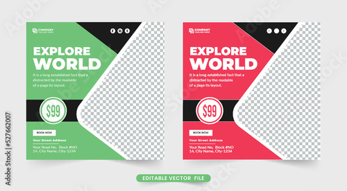 Travel agency promotion advertisement social media post vector. Touring group and holiday planner template with red and green colors. Family vacation planner design for touring agency.