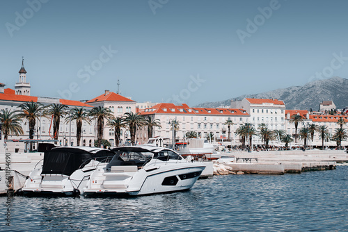 Travel by Croatia. Beautiful landscape with Split Old Town on sea promenade. Yacht in the harbour.