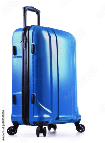suitcase, baggage, baggage, bag, travel, trip, transport, terminal, station, recreation, pocket, loading, packing, object, aeroplane, large, journey, hotel, booking, holiday, custom, handle, business, boarding, aerodrome, polycarbonate, plastic, isolated, white, blue