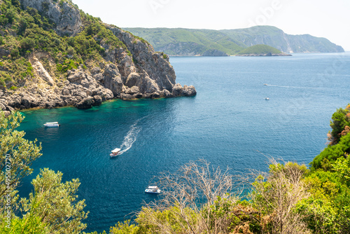 travel, tour tourism, escape, coastline, sea, cliff, rock formation, scenic, summer, sunlight, tree, green, greece, no people, outdoors, day, landscape, horizontal