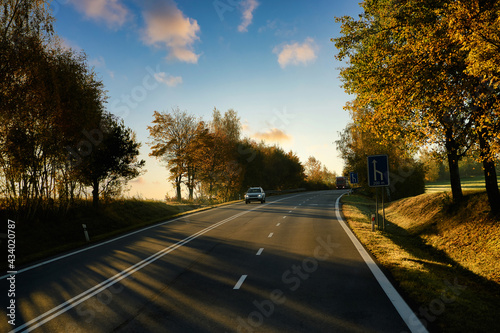 Travel with beautiful European driving routes, highways and cars and both sides with big trees changing color in autumn, rural views and evening lights create a romantic atmosphere.