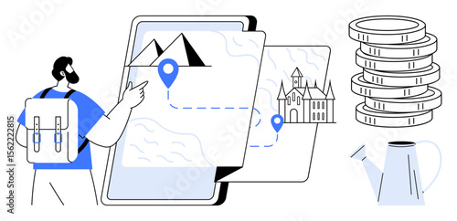 Traveler analyzing digital map with backpack, pinpoint marking mountains and landmarks. Coins indicate travel budget, watering can implies growth. Ideal for travel, planning, finance, tourism