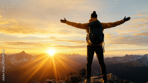 Traveler stands on mountain peak, arms wide open, embracing stunning sunset