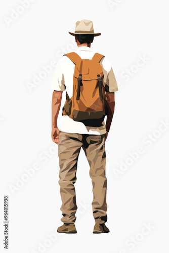 illustration, exploration, adventure, backpack, clothing, apparel, sunhat, hiking, nature, person, travel, vector, adult, human, gear, male, vest, bag, hat, man, traveler