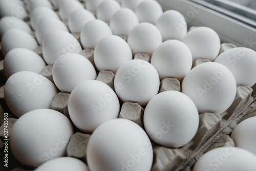 Tray of white fresh eggs close-up on a cardboard form. Agricultural industry