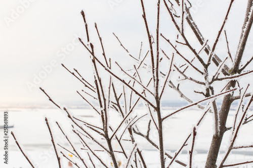 Tree branches covered with snow. White tree branches