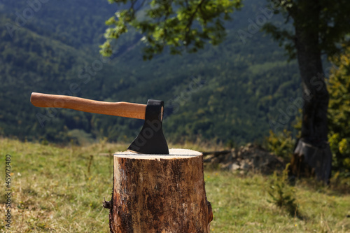 object, nobody, tree, outdoors, tool, professional, stump, axe, axe, handle, lumberjack, action, blade, wood, timber, background, wooden, chop, natural, cut, environment, forest, rustic, countryside, rural, energy, timbering, warmth, material, fire, heat, preparation, village, heating, carpenter's shop, firewood, warm, fireplace, winter, alternative, bio, equipment, hill, grass, mountain