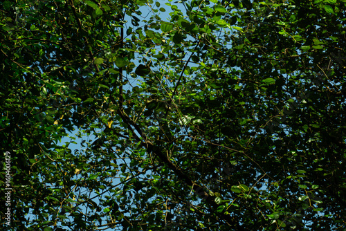 green tree, blue skies, nature scene, clear sky, sunny day, tree branch, green plant, environment, environmentally friendly, sky background, scenic view, blue background, natural light, tall trees, flora, greenery, botanical, clean air