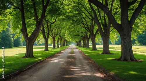 Tree-lined pathway with lush green foliage on both sides and soft sunlight creating dappled shadows on a dirt road Copy Space