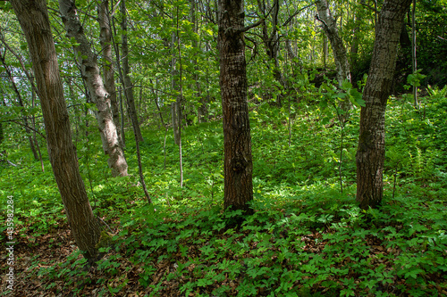 Trees in fresh green forest with beautiful green leaves on the ground. Ringve Botanical garden. Light between the tree trunks. Trondheim, Norway.