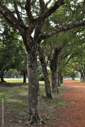 Trees in park with stone path next to it
