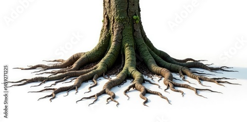 Tree's roots spread out across the ground against a stark white background, isolated, roots,