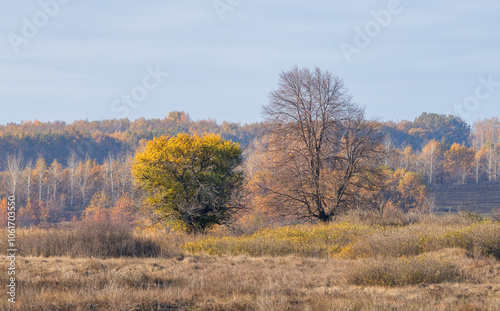 Trees with leafless leaves against a bleak autumn landscape