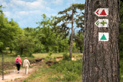Trek sign on a tree, defocused figures walking on a forest path