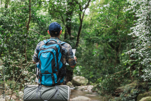 Trekker checking a map for direction. Traveler with backpacker lost in jungle.