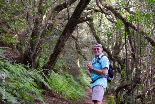 Trekking day in the forest for a happy senior man looking at camera smiling enjoying nature and healthy lifestyle in vacation or retirement