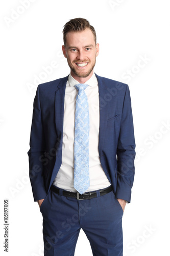 Trendy businessman standing against a white background wearing a blue suit, white shirt and a light blue tie. Staring at camera.