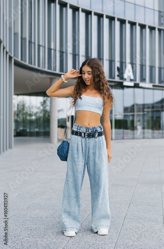 girl, generation, alpha, stylish, trendy, curly, confident, modern, architecture, casual attire, denim, youth, summer, outdoors, cheerful, vibrant, bright, crop, relaxed, playful, natural, happy, carefree, model, chic, light, blue, jean, aesthetic, urban, fashion, smiling, young, pose, lifestyle