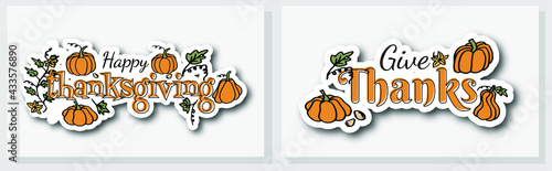 Trendy hand drawn Thanksgiving stickers with pumpkins. Good for invitation, card, flyer, cover, banner, placard and brochure. Vector illustration.