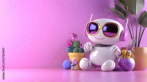 robot, friends, cactus, plant, pot, flower, purple, room, trendy, cool, sunglasses, earphones, pink, white, gold, cute, happy, cheerful, modern, minimalist, decor, interior, design, technology, artificial, intelligence, fun, joy, summer, spring, bright, vibrant, pastel, background, illustration, three-dimensional, render, image, graphic, style, aesthetic, scene, artwork, digital, art, object, space