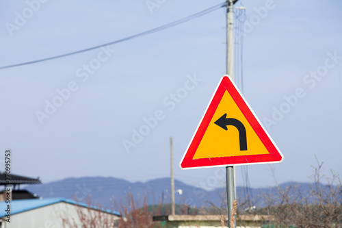 signs, road, warning, traffic, sky, roadsign, blue, symbol, danger, caution, yellow, street, arrow, safety, highway, transportation, roadsign, triangle, crossing, travel, attention, red, asphalt, drive, speed, landscape, background, countryside, warning sign, outdoors, no people, horizontal, forest, decision, country road, color image, south korea, korean