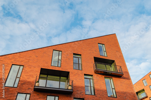 apartment, balcony, blue skies, building, building design, copenhagen, denmark, exterior, facades, looking up, panel, peak, residential, triangular, urban, urban living, window