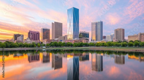 Triangulation control, A stunning city skyline at sunset, reflecting beautifully in a calm body of water, showcasing modern architecture amidst vibrant colors.