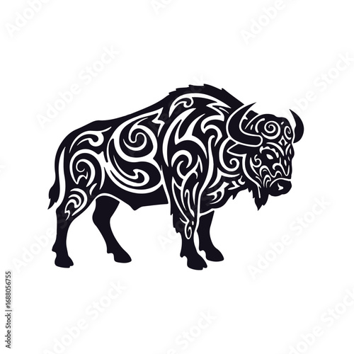 bison, buffalo, tribal, illustration, art, design, pattern, stylised, animal, wildlife, vector, graphic, silhouette, tattoo, ornate, intricate, swirl, scroll, ethnic, native, abstract, monochrome, black, white, symbol, emblem, logotype, icon, motif, decoration, artwork, drawing, vignetting, creature, mammal, bull, bovine, wild, nature, powerful, majestic, strong, spirit, freedom, strength, wilderness, plain, american, indigenous