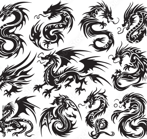 dragon, tattoo, tribal, vector, mythical, beast, fantasy, black, ink, fire, chinese, creature, fierce, power, monster, symbol, abstract, bold, oriental, curve, brute, danger, flames, tail, art, design, pattern, traditional, culture, stylised, graphic, outline, drawing, wild, decorative, animal, horn, magic, scale, aggressive, tattooed, print, clip art, element