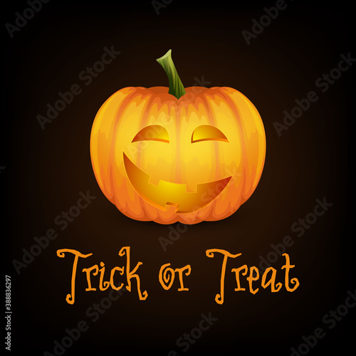 Trick or Treat. Happy Halloween Banner with Pumkin. Vector Cartoon Halloween Pumkin Lantern with Funny Face on Dark Background. Front View. Design Template. Autumn Holidays, Halloween Concept