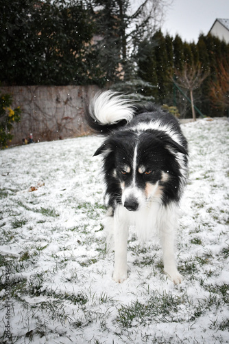Tricolor border collie is standing on the field in the snow. He is so fluffy dog.