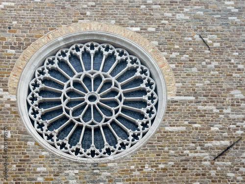 Trieste, Italy - June 27, 2024: Trieste, Italy - June 27, 2024: Cattedrale di San Giusto Martire, Cathedral at San Giusto castle. Outside front wall with closeup of gothic style rose window