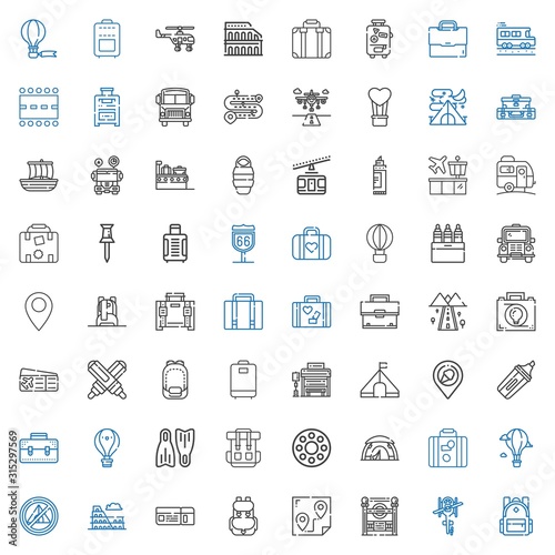 trip, icon, set, vector, backpack, helicopter, subway, entrance, route, boarding, pass, coliseum, tent, hot, air, balloon, baggage, rolling, wheel, flipper, briefcase, marker, place, bus, stop, plane, ticket, road, pin, marker, suitcase, vans, aerodrome, cable, car, sleeping, bag, school, runway, illustration, symbol