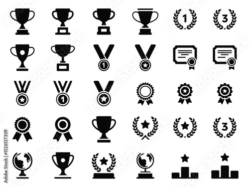 trophy, medal, icon, badge, award, certificate, achievement, success, globe, dais, champion, laurel, prize, winner, number one, first place, star, rosette, ribbon, reward, best, contest, competition, decoration, element, emblem, event, graphic, isolated, label, logotype, mark, object, set, signs, symbol, vector, silhouette, clip art, illustration, pictogram, glyphs