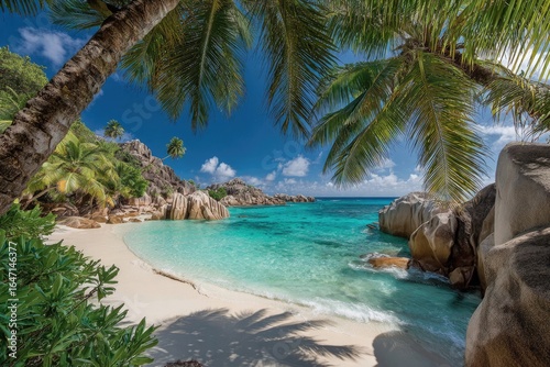 beach, paradise, tropical, palm, tree, turquoise, water, blue, ocean, coast, sunny, sky, white, sand, rock, granite, island, nature, vacation, relax, tranquil, serenity, exotic, lush, green, vegetation, calm, travel, scenic, beautiful, stunning, summer, holiday, adventure, coastal, view, pristine, picturesque, inspiring, gorgeous, delightful, amazing, vibrant, high-coloured, outdoors