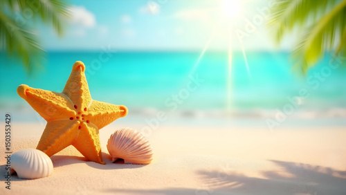Tropical Beach Scene with Orange Starfish and Seashells on Sandy Shore – Bright Summer Vacation Background with Palm Trees and Blue Ocean.