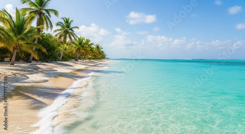 beach, tropical, palm, tree, ocean, water, turquoise, blue, sky, cloud, sunny, white, sand, wave, calm, coast, tranquil, paradise, vacation, relaxation, summer, holiday, travel, beautiful, scenic, serenity, exotic, island, coastal, nature, outdoors, scenery, high-coloured, light, clear, gentle, horizon, landscape, view, warm, sunshine, relaxing, destination, seacoast