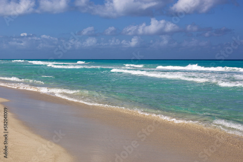 Tropical beach with sand on a ocean, view to azure waves and sky with clouds. Caribbean coast, Background for holidays on a paradise nature