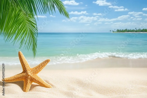 Tropical beach with sea-star in sand, copyspace for text. Concept of summer relaxation